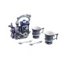 Гжель – это один из традиционных российских промыслов. Всем нам знакома фарфоровая посуда и различные фигурки бело-синего цвета. Да, Гжель начиналась именно с этого. Но время шло, и российские мастера достигли невероятных высот в своем искусстве. Предметы, входящие в набор, изготовлены из высококачественного фарфора с подглазурной росписью кобальтом и надглазурной росписью керамическим золотом и цветными красками (пигментами).